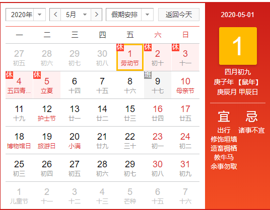 5月1日至5日放假調(diào)休,共5天。4月26日(星期日)、5月9日(星期六)上班