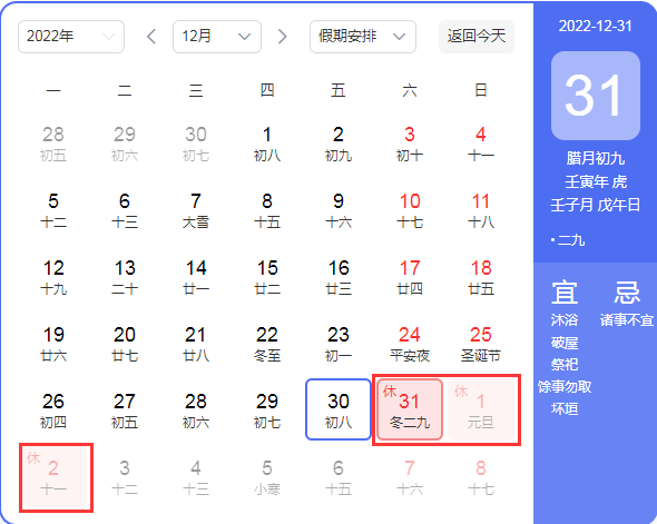 2022年12月31日(星期六)-2023年1月2日(星期一)放假,共3天。2023年1月3日(星期二)上班。